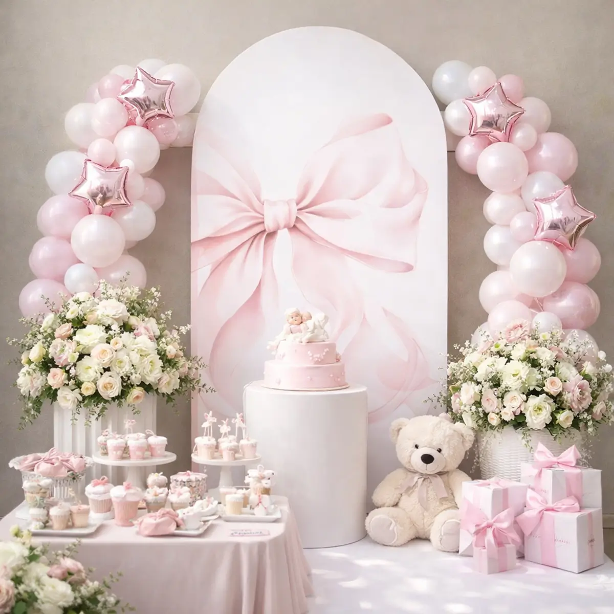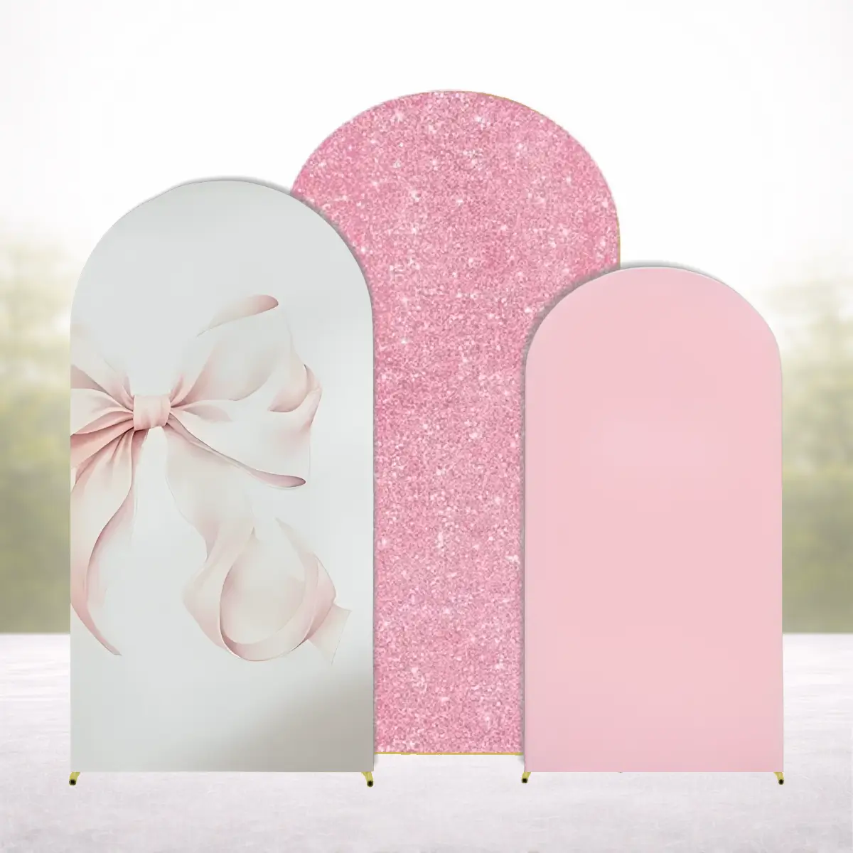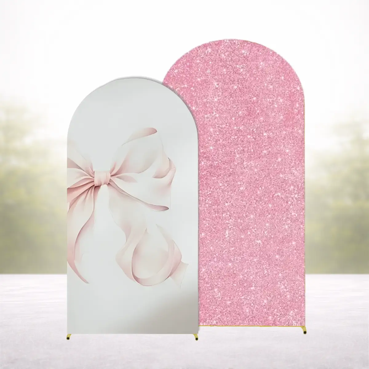 - Lej nemt dette smukke betræk til buet backdrop stativ i hvid med lyserød sløjfe.