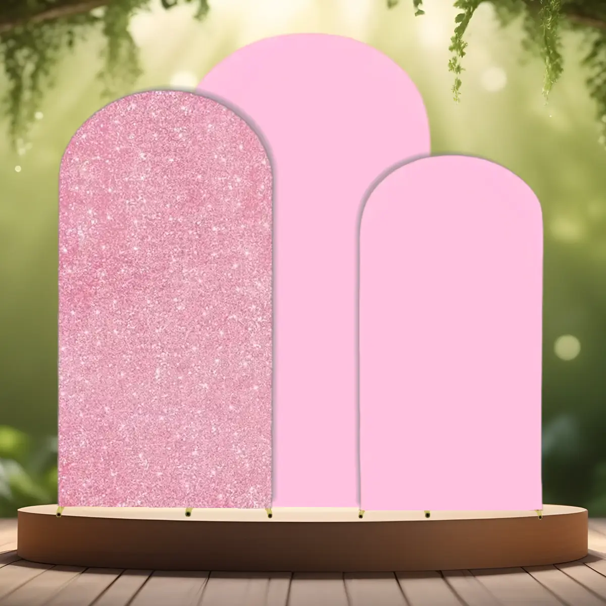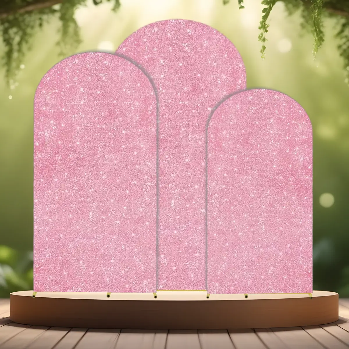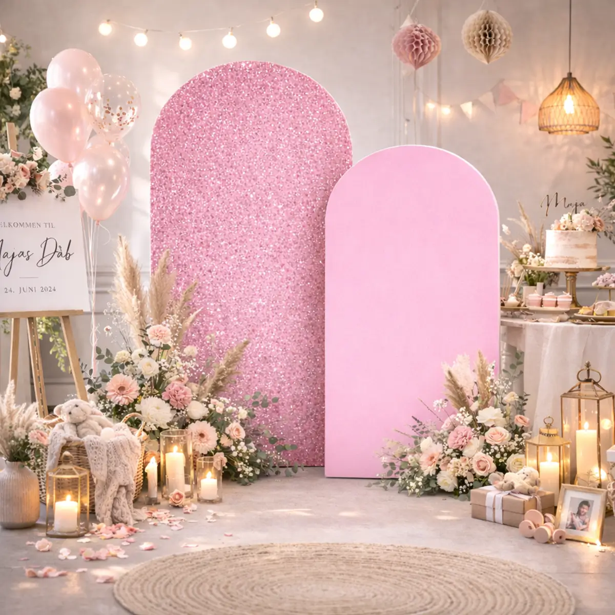 - Lej nemt dette betræk til buet backdrop stativ med rosa pailetter.