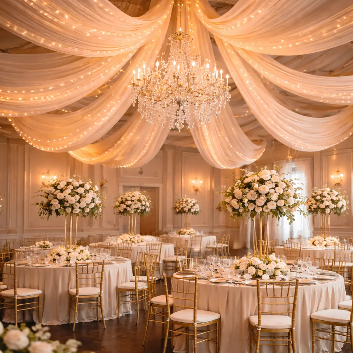 - Stoffet er ideelt som backdrop, til vielsesbuen, ophæng i loft mv.