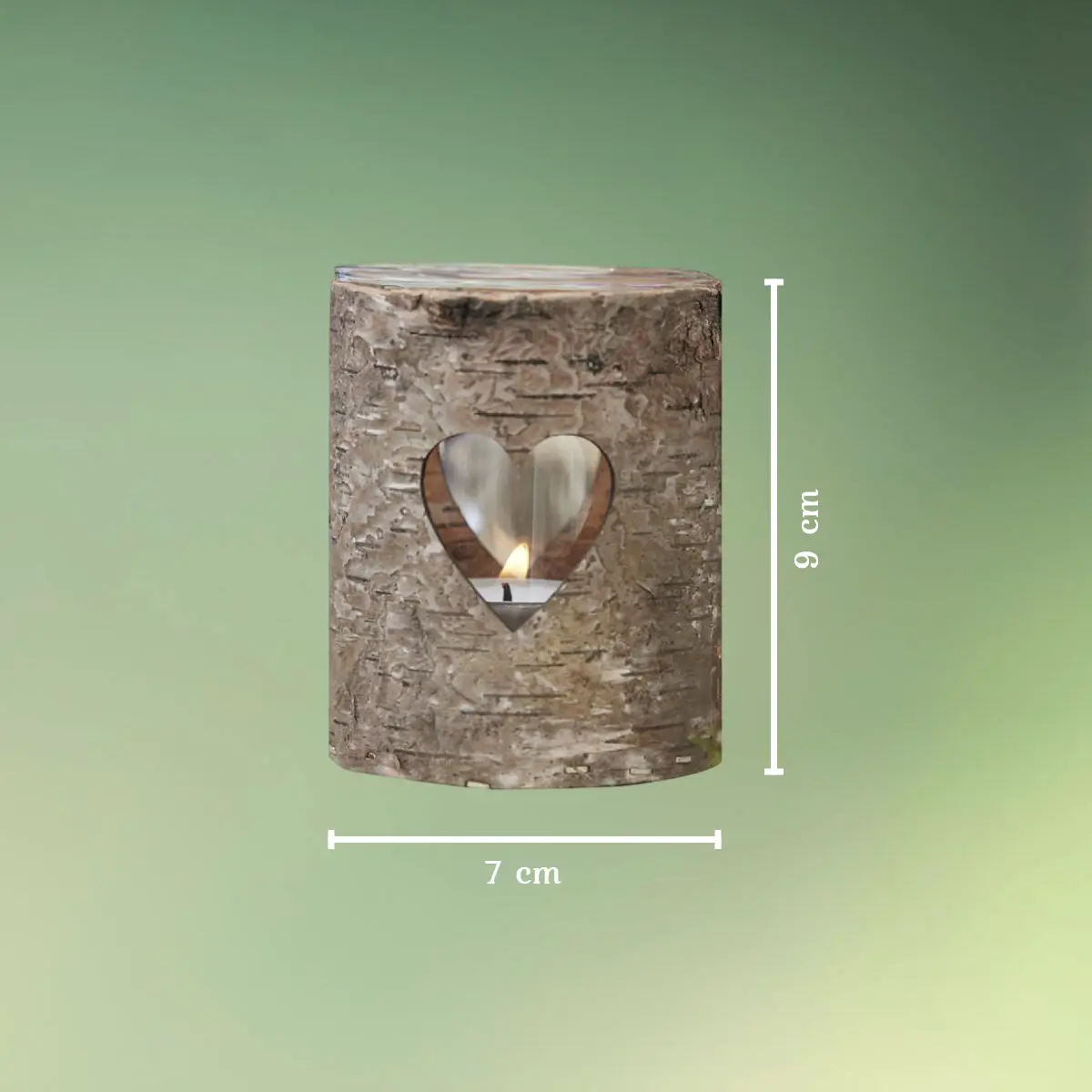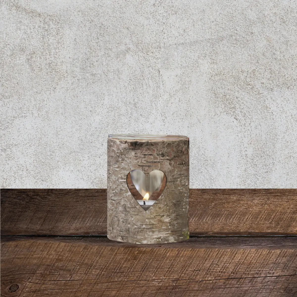 - Lysestagen er af bark med et hjerteformet hul og glas inden i.