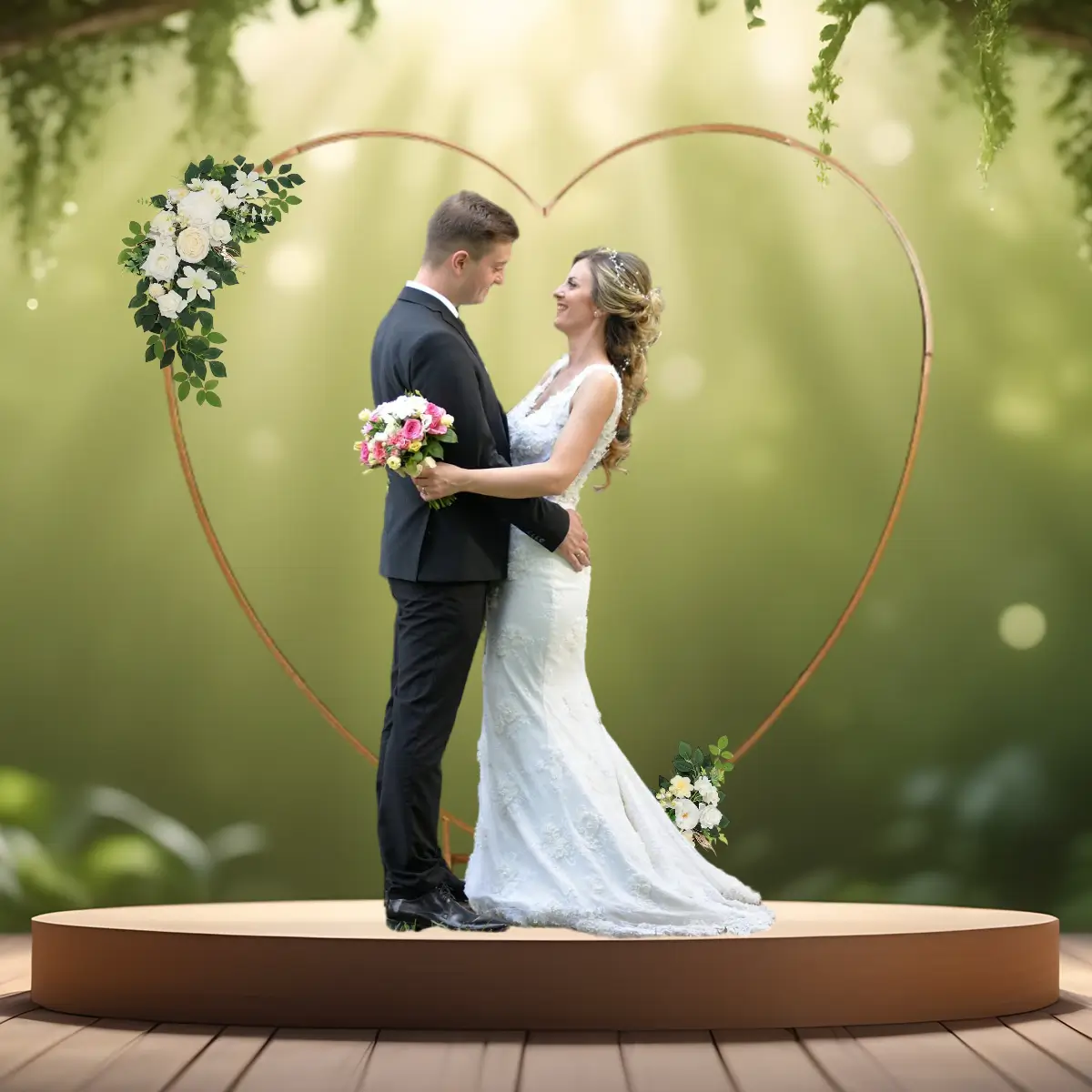 - Lej nemt denne hjerteformede vielsesbue/backdrop stativ i guld.