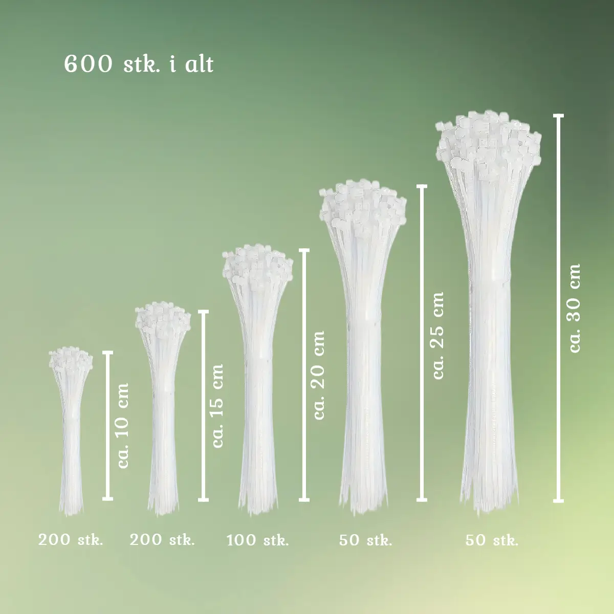 Klare strips | Kabelbindere | Pakke med 600 stk. i fem størrelser
