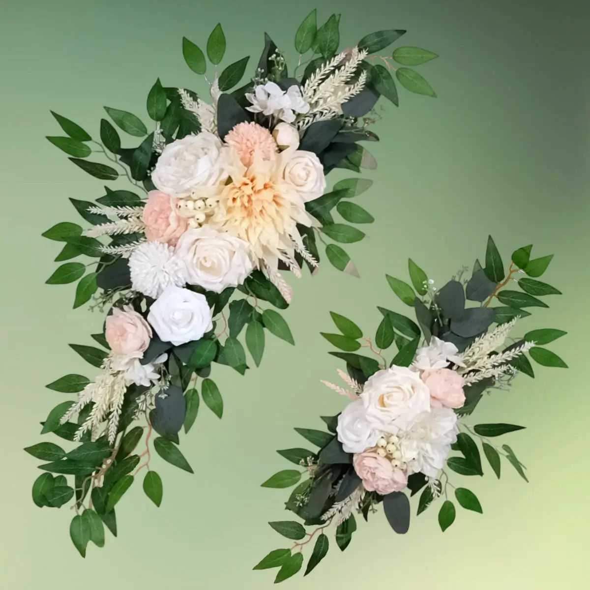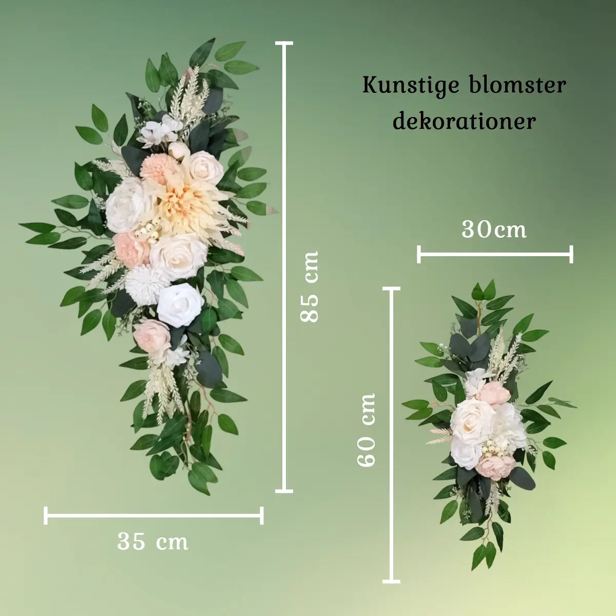 - Sættet består at 2 dekorationer med lys ferskenfarvede, hvide og let cremefarvede blomster.
